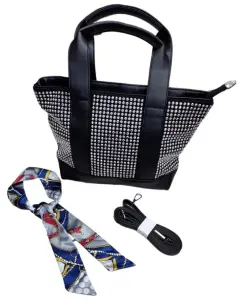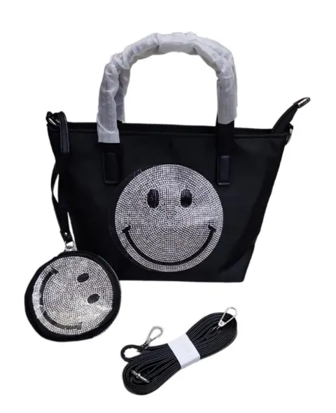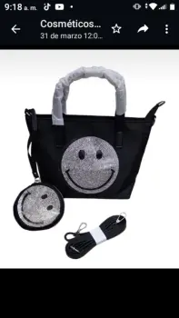 Bolsa con estoperoles color negro. Hermosa bolsa negra con estoperoles, dos modelos diferentes.Una de ellas trae una mascada con su correa y la segunda trae el dibujo de la carita feliz y incluye un monedero, también tiene su correa.