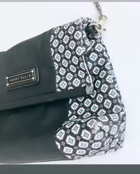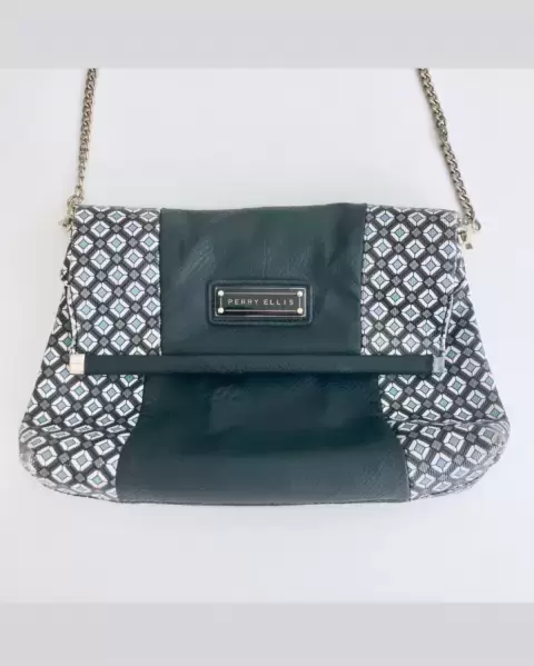 * De piel sintética, forro de tela* Cierre magnético* Pequeñas manchas de maquillaje en el forro que no pude quitar, esquinas leve raspadas, le falta un refuerzo de metal en la solapa * Medidas en cm: largo 28, alto 21, ancho 7