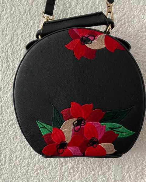 Bolsa de flores. Hermosa, la use pero esta muy bien cuidada, no tiene detalles de uso. Se ve pequeña pero es muy amplia, cabe un celular, cartera, labial, llaves... jeje