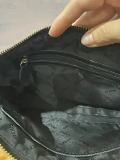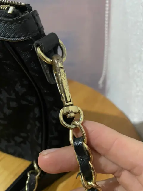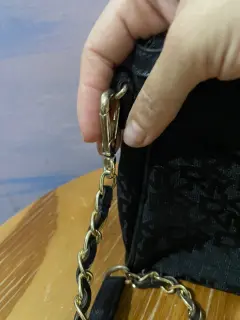 Bolsa en tela, excelente condición o estética, strap tipo cadena algunos eslabones levemente opacos, jaladera del cierre igual un poco opaca.