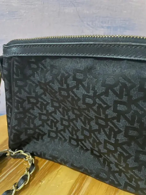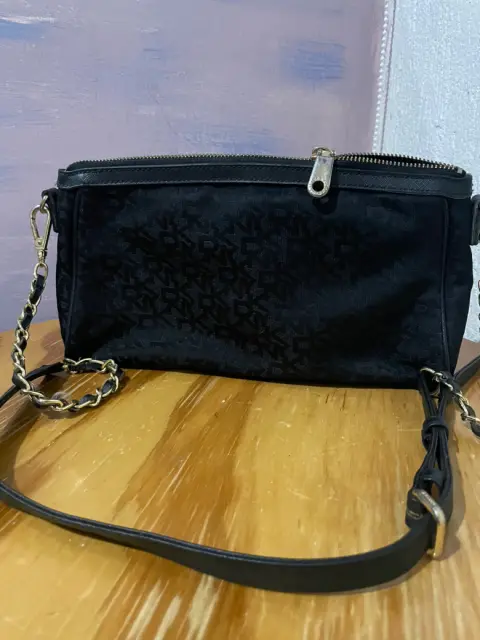 Bolsa DYNY crossbody. Bolsa en tela, excelente condición o estética, strap tipo cadena algunos eslabones levemente opacos, jaladera del cierre igual un poco opaca.