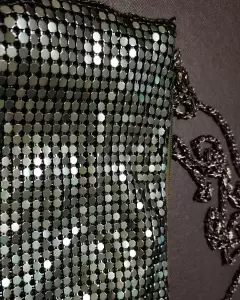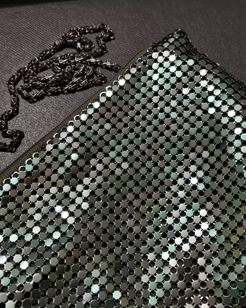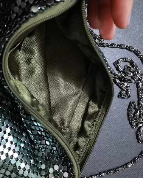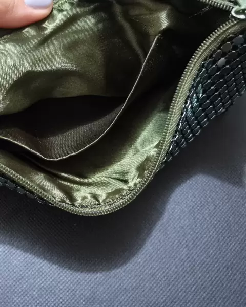 BOLSA METAL TORNASOL. Es color verde oscuro brilloso tipo metal pero no pesaPor dentro viene forradaMuy original