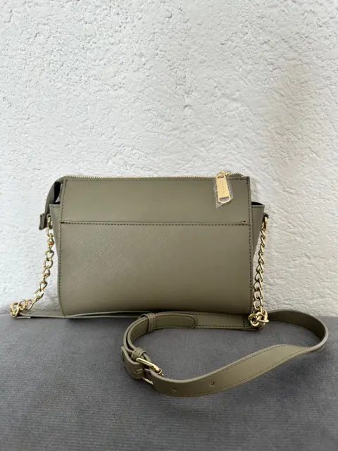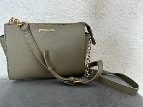 Bolsa Steve Madden. Bolsa color verde militar, con correa de hombro encadenada. El exterior cuenta con un bolsillo. Medidas: L:26xA:19xA:11