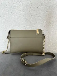 Bolsa color verde militar, con correa de hombro encadenada. El exterior cuenta con un bolsillo. Medidas: L:26xA:19xA:11