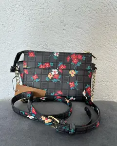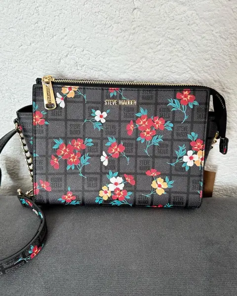 Bolsa Steve Madden. Bolsa negra con flores, Steve Madden con correa de hombro encadenada. El exterior cuenta con un bolsillo. Medidas: L:26xA:19xA:11