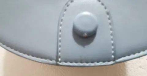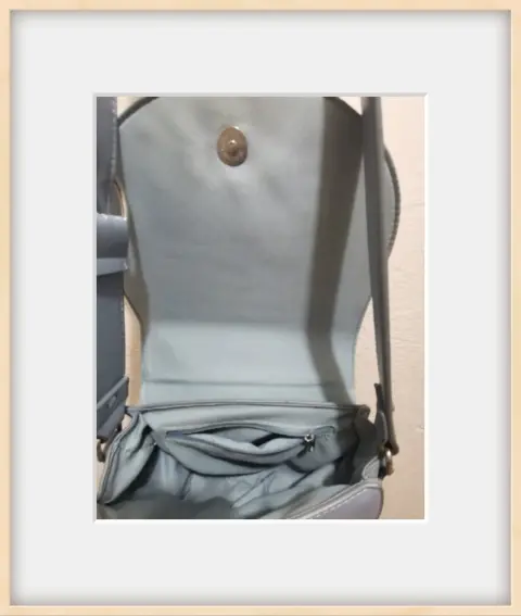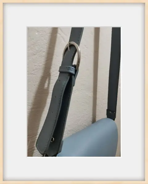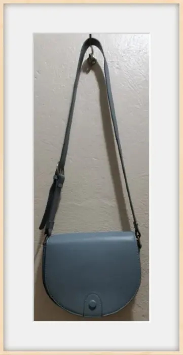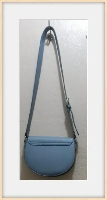 Linda bolsa, en tono azul celesteMaterial tipo pielLargo ajustableTiene un raspón del tapalo de un puntito en el botón frontal ( se muestra en la fotografía)