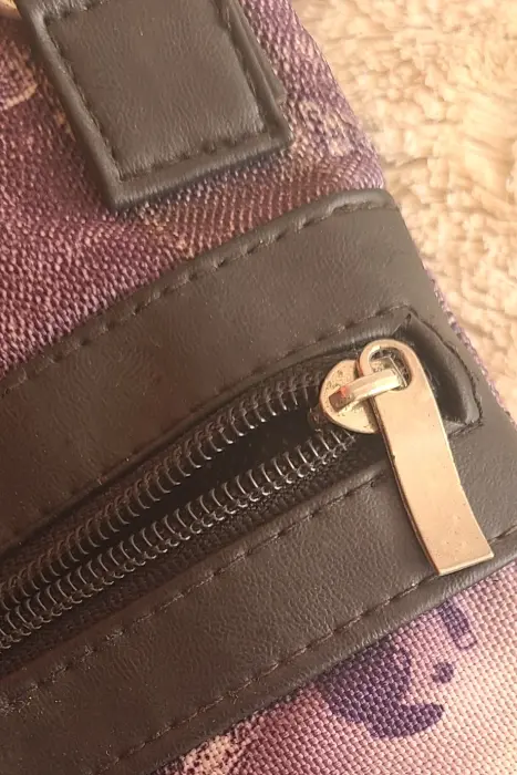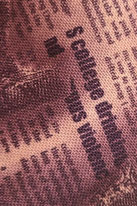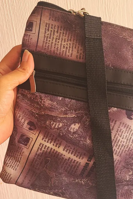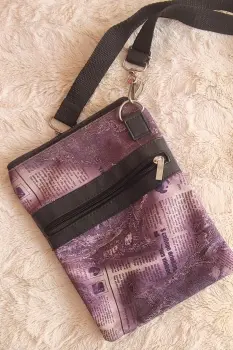 Bolsa tipo crossbody. Interior forrado. Cierre principal y cierre frontal. Color: Morado con diseño imprenta periódico 📏 Medidas: Largo 24 • Ancho 19 cm