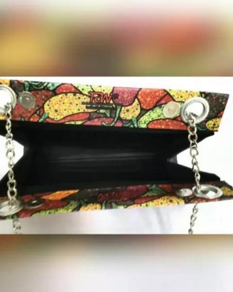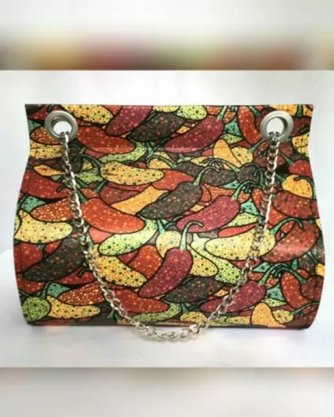 Bolsa Vante en tela tipo raso, mod CHILES, inspirada en el maravilloso fruto mexicano, en base color NEGRO y tonos MULTICOLOR, c/herrajes tono plata brillante. Cuenta c/compartimiento principal c/bolsillo interior sencillo, cierre mediante snaps. Exterior: tela tipo raso 100% poliéster, forro: vinil seda 100% poliéster. Dimens cms: 26.5 largo, 25.5 alto, 11.5 profundidad.