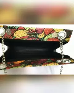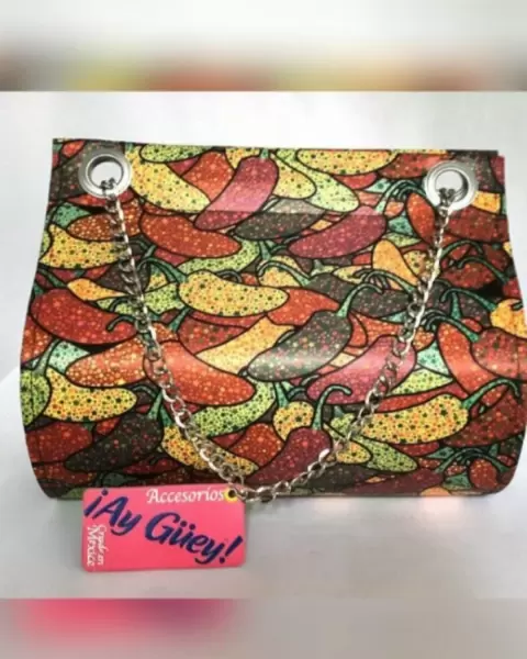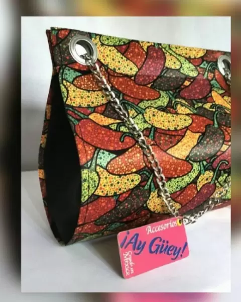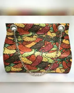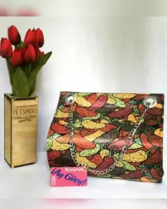 Bolsa Vante en Tela Mod Chiles. Bolsa Vante en tela tipo raso, mod CHILES, inspirada en el maravilloso fruto mexicano, en base color NEGRO y tonos MULTICOLOR, c/herrajes tono plata brillante. Cuenta c/compartimiento principal c/bolsillo interior sencillo, cierre mediante snaps. Exterior: tela tipo raso 100% poliéster, forro: vinil seda 100% poliéster. Dimens cms: 26.5 largo, 25.5 alto, 11.5 profundidad.