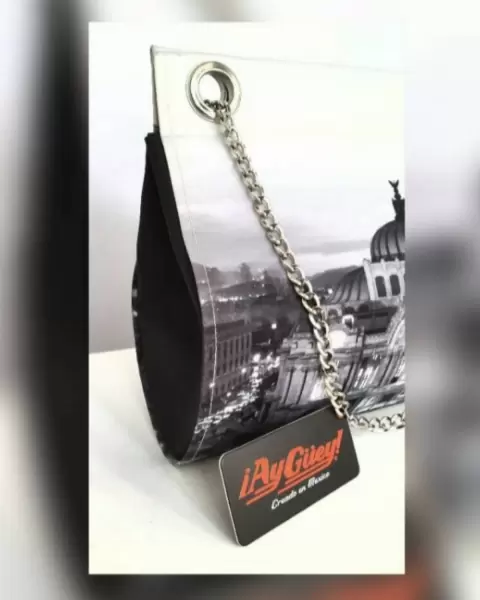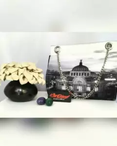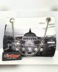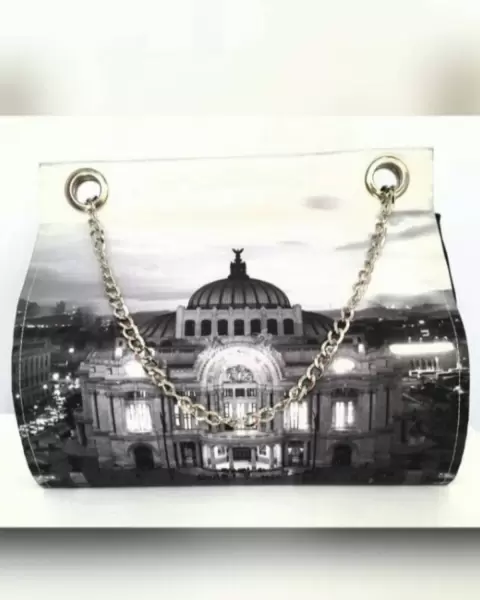 Bolsa Vante Mod Bellas Artes. Bolsa Vante en tela tipo raso, mod BELLAS ARTES, inspirada en el Palacio de Bellas Artes de CDMX, en base color GRIS y tonos NEGRO y GRISES, c/herrajes tono plata brillante. Cuenta c/compartimiento principal c/bolsillo interior sencillo, cierre mediante snaps. Exterior: tela tipo raso 100% poliéster, forro: vinil seda 100% poliéster. Dimens cms: 26.5 largo, 25.5 alto, 11.5 profundidad.