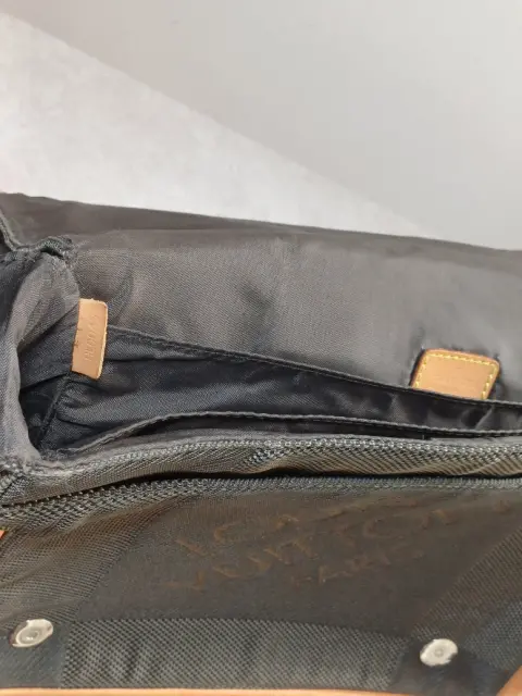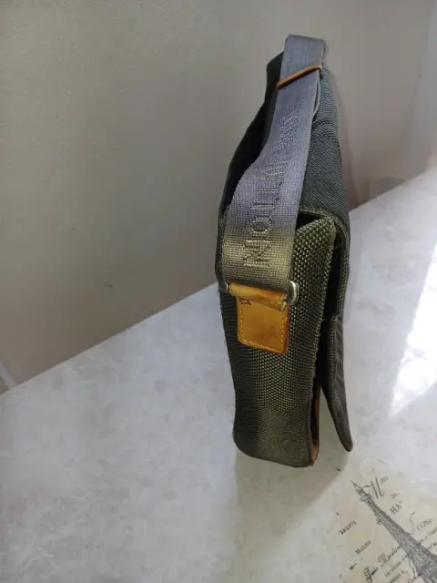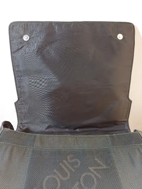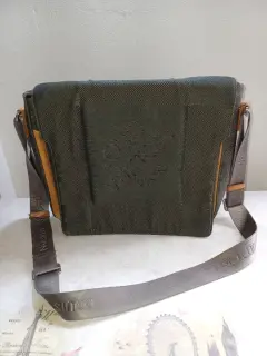 Bolso bandolera Louis Vuitton en tela color verde gris oscuro con 3 separaciones, correa con 2 ajustadores. Trae detalle mínimo en forro interno pero no se ve y tampoco afecta su uso. Esta tal cual fotos.