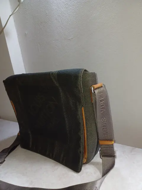 Bolso bandolera Louis Vuitton. Bolso bandolera Louis Vuitton en tela color verde gris oscuro con 3 separaciones, correa con 2 ajustadores. Trae detalle mínimo en forro interno pero no se ve y tampoco afecta su uso. Esta tal cual fotos.