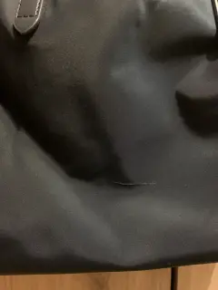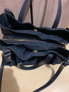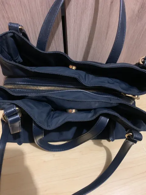 Bolso Bimba y Lola azul marino tiene tres compartimentos, dos cierran con broche y uno con cierre. La placa con el logo está un poco yaya da y tiene una raspadura en la parte de atrás que se muestra en la foto.