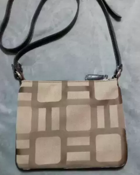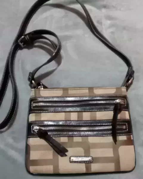 Bolso cross body Nine West. Bolso cross body Nine West en color café/kaki, 3 compartimentos, cierres color plata, 18 cm de largo y 23 cm de ancho..