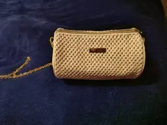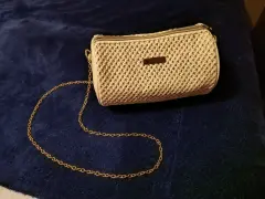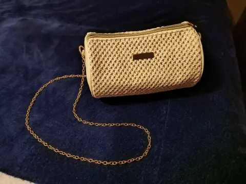 Bolso de mano. Bolso de dama en tono beige con cadena dorada, forro interior con un bolsillo pequeño.
