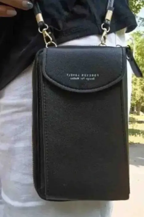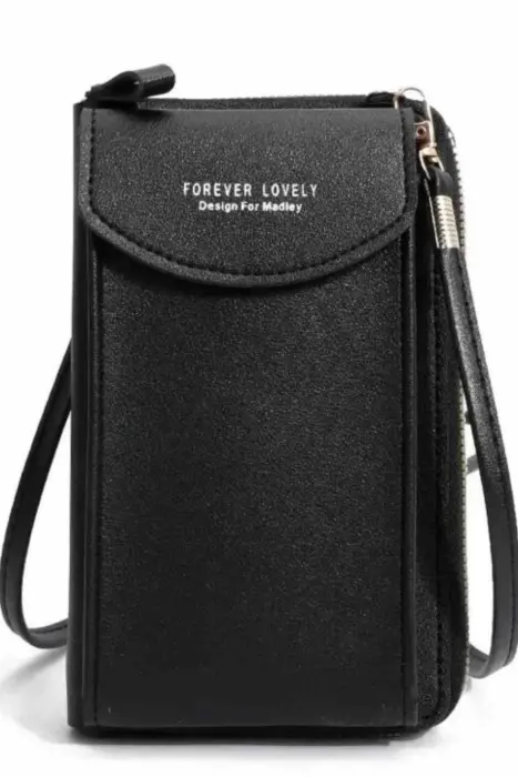 Bolso tipo monedero, correa cruzada, color NEGRO detalles en dorado. Sirve perfectamente para guardar el celular y usarlo como monedero. Tamaño 11x20cm aproximadamente.