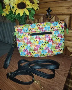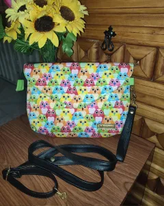 Bolso tela cruzado. Hermoso bolso de vinipiel, tela impresa de búhos, forro al interior de textil, cuenta con una asa corta para utilizar de mano o con una larga para usar cruzada.