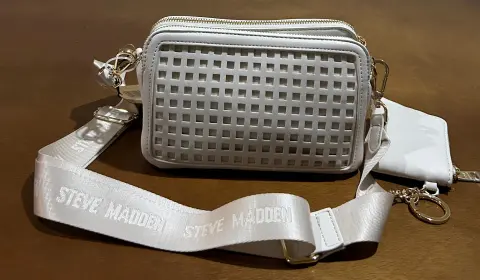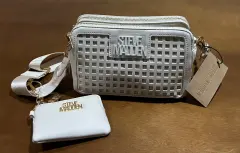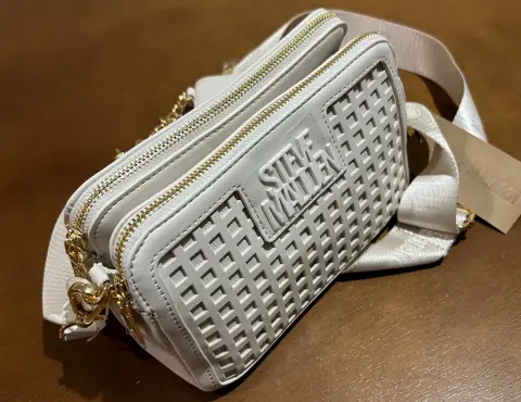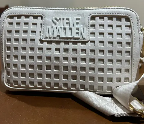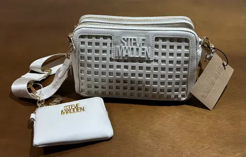 Crossbody doble cartera Steve Madden beige. Crossbody doble cartera una con un compartimento y la otra cartera con dos compartimentos interiores. Espacio en medio con cerrado de broche con imán. Correa ancha y ajustable con holograma de la marca impresa. Incluye bolsita para monedas tipo llavero. Medidas 20 cms de frente 13 cms de alto 9 cms de profundidad