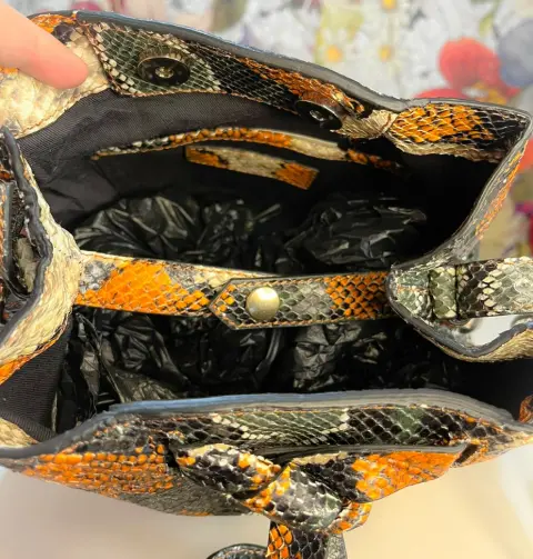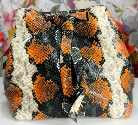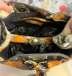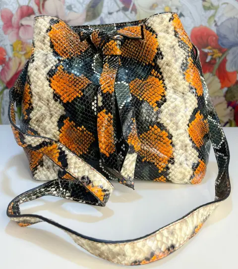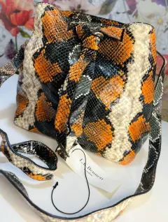 hermosa crossbody estampado de víbora colores marron. amplia por dentro tipo cilindro.bolso de marca de diseñador