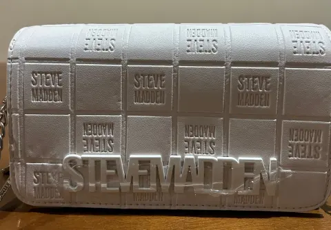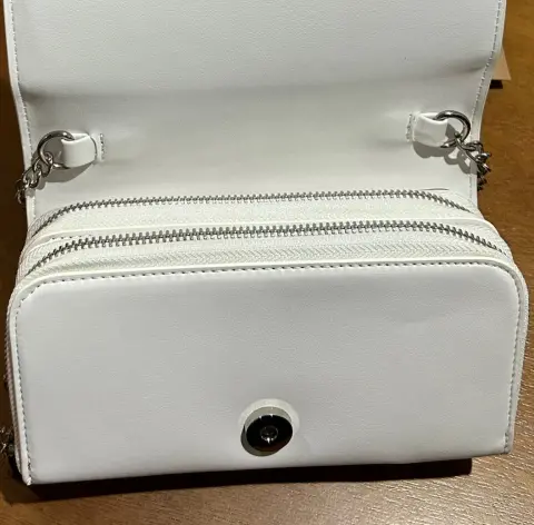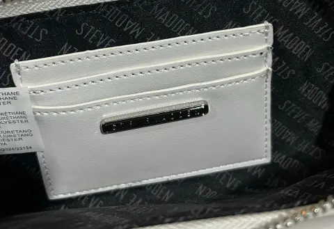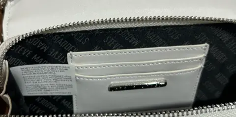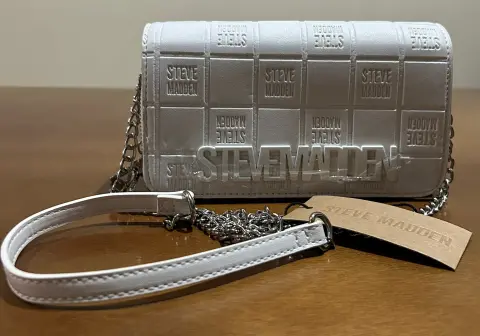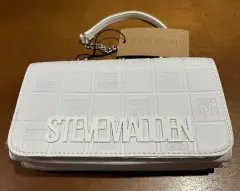 Crossbody Steve Madden doble cartera blanco. Crossbody tipo doble cartera con cierre. Una de las dos carteras con compartimento para dos tarjetas. Cadena larga plateada como correa. Material 100% poliéster. Medidas 19 cms de frente 11 cms de alto 5 cms de profundidad