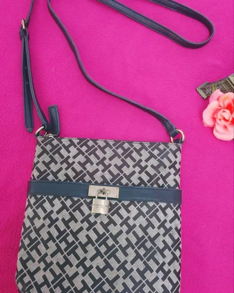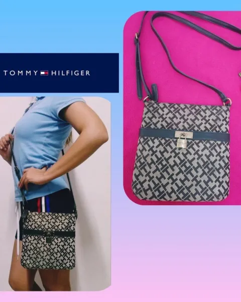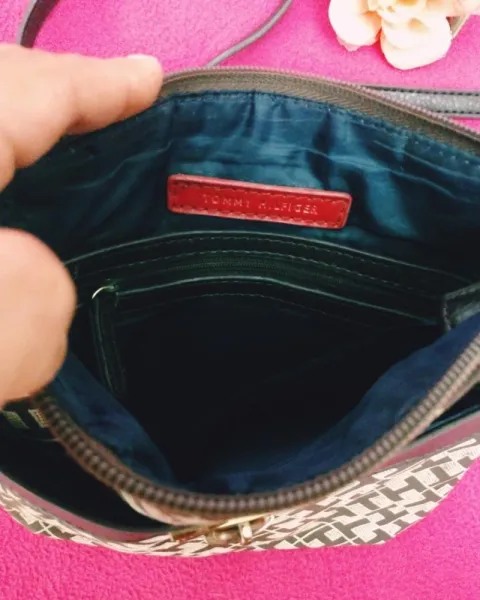 Crossbody TH. Crossbody original y ligera color café, beige y dorado. Bella y súper práctica con dos cierres y tres compartimentos. Detalles en herrajes como rayas y perdida de color, nada que afecte en su uso. Medidas aproximadas 22 cm de ancho por 20. 5 cm de alto. Strap de 127 cm ajustable ¡ Las vas a amar! Te regalo $100 en tu primer compra en shoppiland.com con el siguiente código: Lafemmelegant2BlwE9