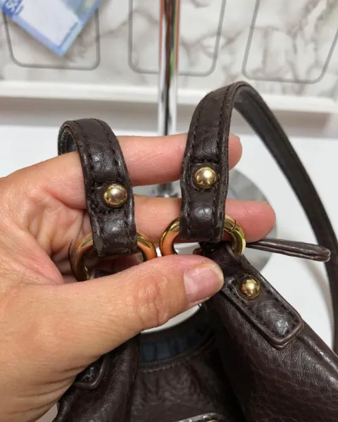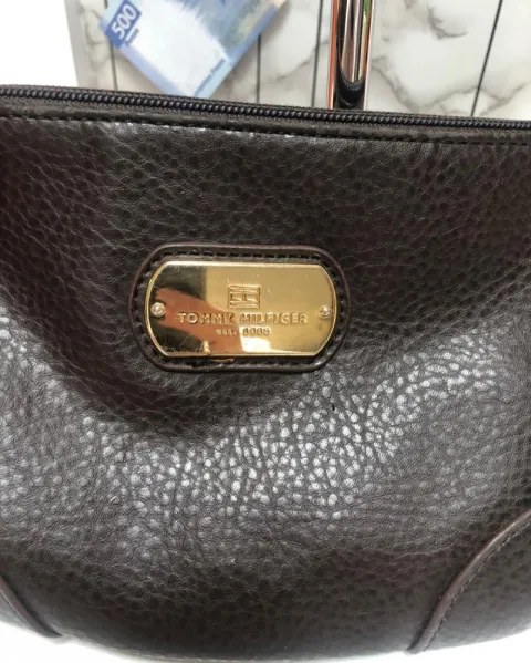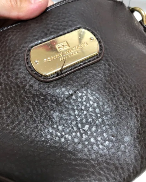Crossbody Tommy Hilfiger Color café interior azul limpio Detalle placa rayada y un rayón al frente y las asas, ver fotos, con mucha vida