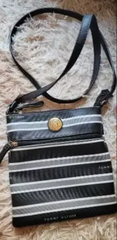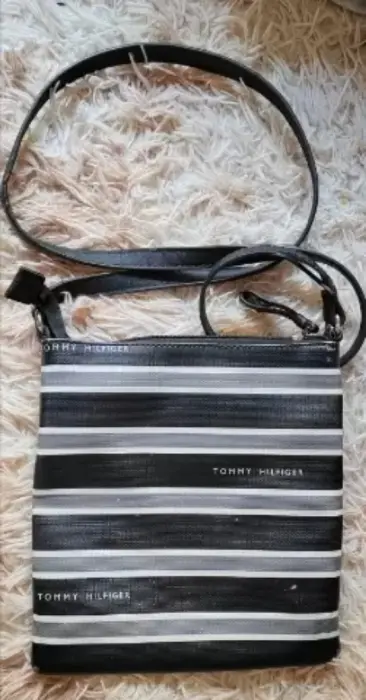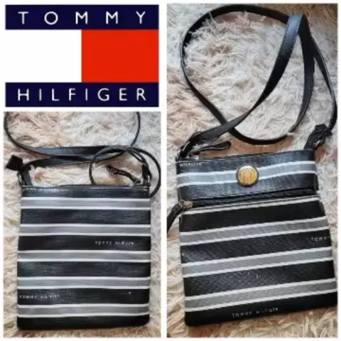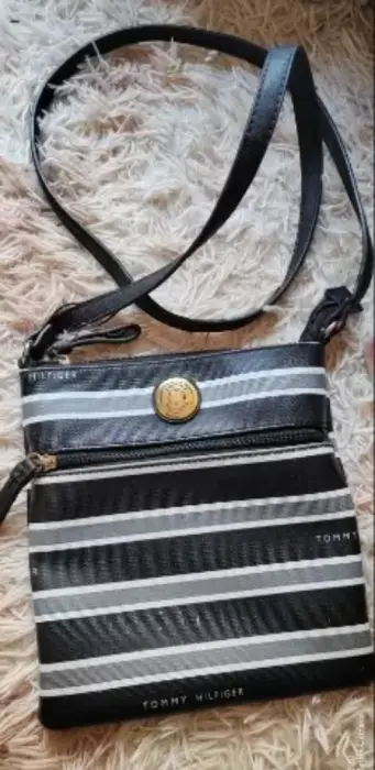 Crossbody Tommy Hilfiger. Bonita crossbody Tommy hilfiger original negro c/rayas gris y blanco, detalles de uso cómo se puede ver en las fotos dejó varias para su perfecta apreciación tiene detallitos de desgaste, se le despegó la gomita de la correa al principio(puedes pegarlo o mandar a restaurar). Mide 23cm alto X 21.5cm de ancho👜😍❗ PRECIO FIJO❗OJO!! Grabo antes de enviar por seguridad de mi prenda, corroborando su estado 👁️👁️