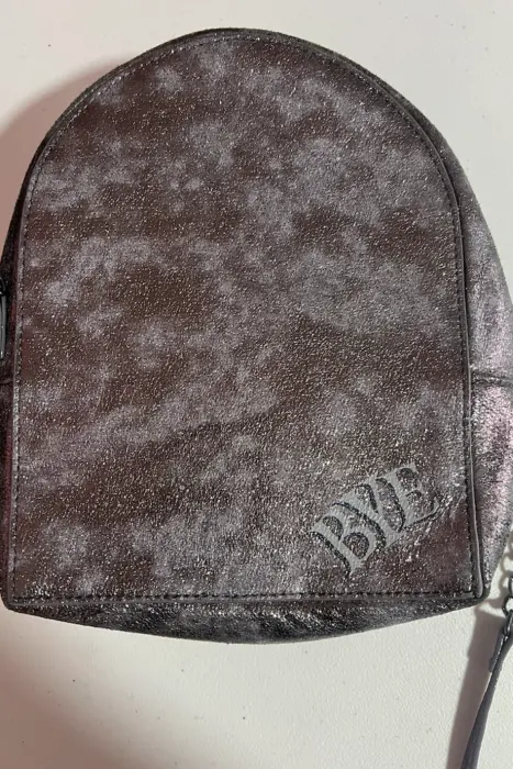 Perfecta para las más alternativas,con forma de tumba de Halloween, tiene una silueta estructurada con una larga correa cruzada. La superficie con textura metálica brillante incluye los detalles Died Laughing y Bye. Se le cayó el corazón rojo que tenia en el cierre y se ve desgaste minimo en una esquina de abajo (ultima foto).Medidas: 6 cm de ancho x 20 cm de alto x 7 cm profundidad, correa 58 cm.