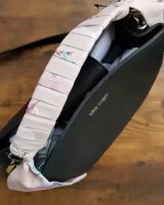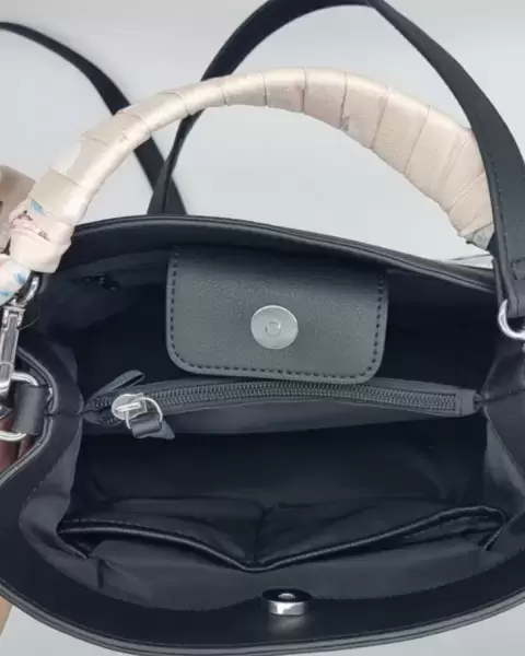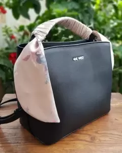 Lindo bolso coqueto, con espacio para lo esencial.Medidas Largo 25 cm x alto 20 cm x ancho 12.5 cmColor negro con mascada de colores, varios compartimentos, con un cierreAsas cortas y 1 larga ajustable
