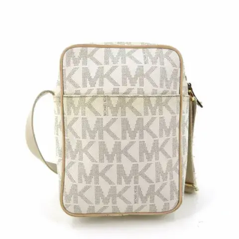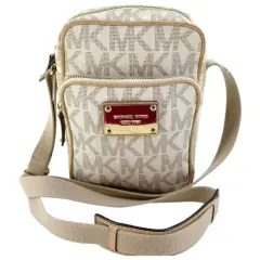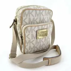 Michael Kors Crossbody. Bolso Michael Kors tipo crossbody en piel color beige con estampado monogram, de doble compartimento, con correa ajustable con placa decorativa al frente