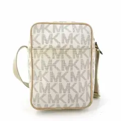 Bolso Michael Kors tipo crossbody en piel color beige con estampado monogram, de doble compartimento, con correa ajustable con placa decorativa al frente