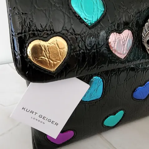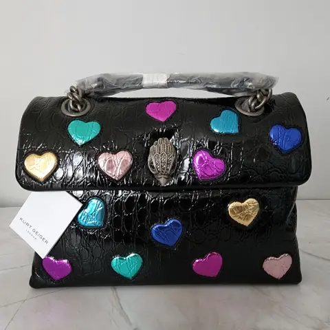 Producto nuevo y originalPregunta por disponibilidadHermosa bolsa marca Kurt Geiger con corazones de colores. Por fuera es 100% piel.