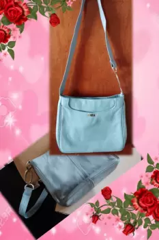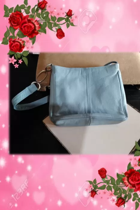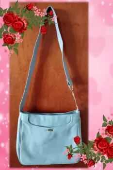 bolsa azul claro, sintética, rectangular, asa al hombro, el forro de adentro es de tela, esta en perfecto estado, el vinilo no esta maltratado.
