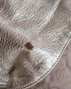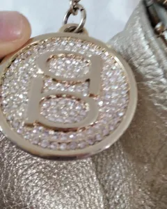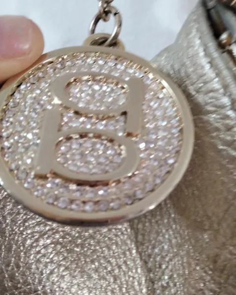 Bolsa Bebe dorada tiene una mancha pero es en el dobles así que no se nota para nada, también un poco de desgaste en la plaquita y el arnés del asa.