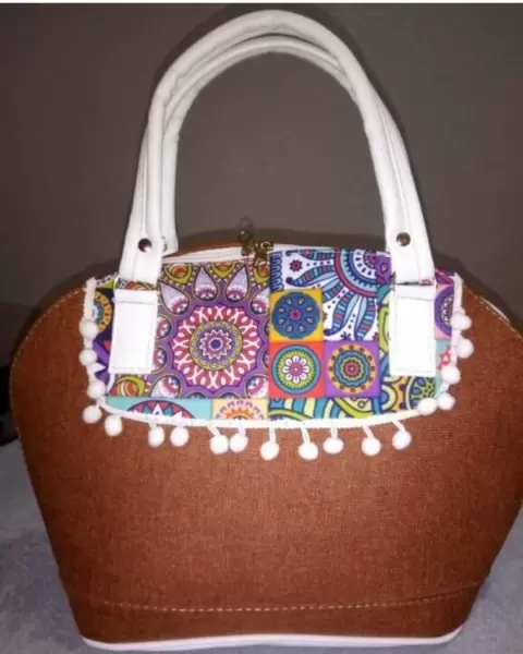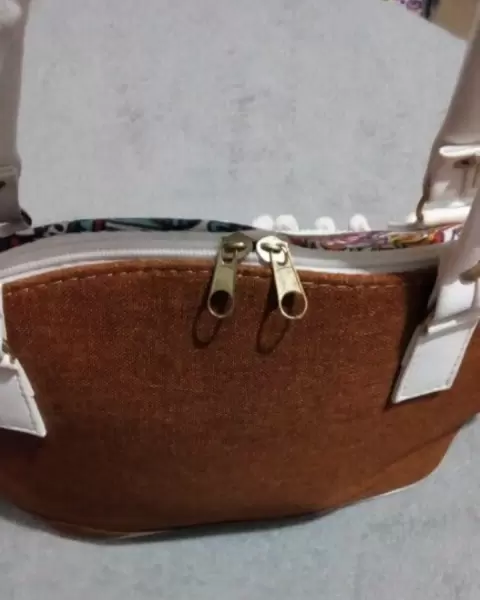 Bolsa café y blanco, estampada fractales. Bolsa de mano chica, en color café con blanco, estampada en el área superior con fractales multicolor, asas pequeñas en color blanco, con doble cierre, 26 cm de largo y 40 de ancho