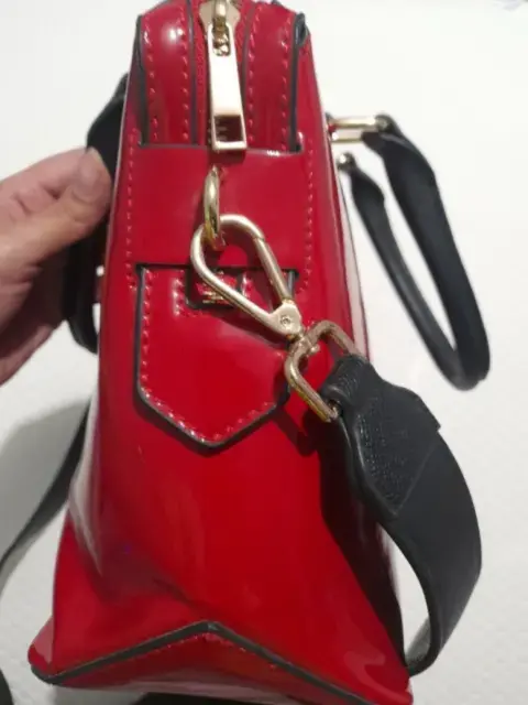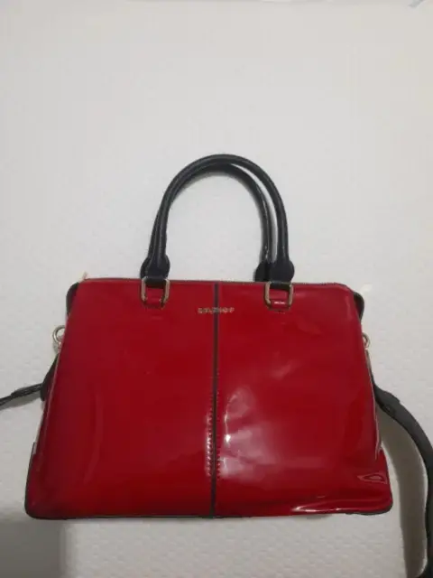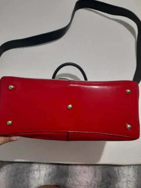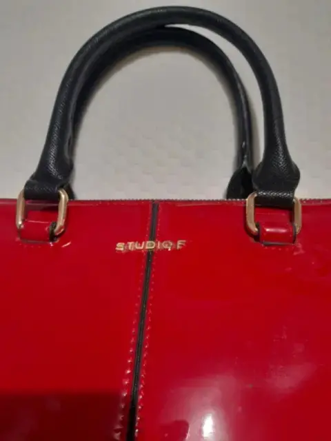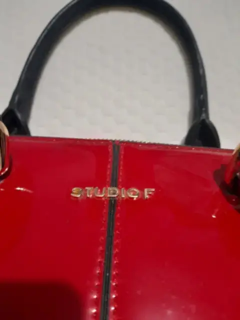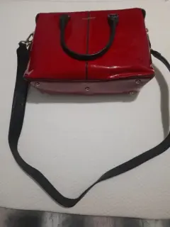 Bonita bolsa de Charol color Rojo, marca Studio F, cuenta con asa larga desprendible, muy poco uso, viene con su cubrepolvo, sin detalles