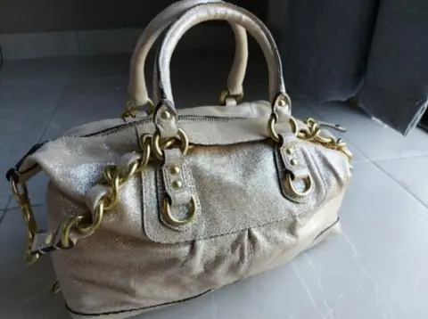 Bolsa Coach Madison Sabrina Shimmer. Edición limitadainterior tiene un bolsillo con cremallera grande y 1 bolsillo abierto El forro sedoso es de color lavanda. El exterior es un hermoso color beige brillante que parece diamantes brillantes. 3 etiquetas colgantes con cierre total de cremallera superior, un correa de hombro extraíble (20 pulgadas de largo). 13 "de largo x 5" de ancho x 9 "de alto