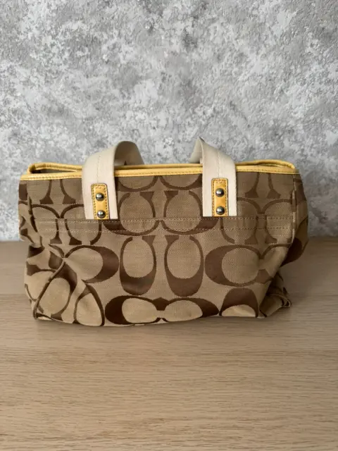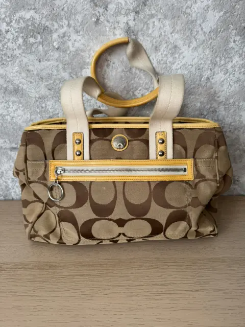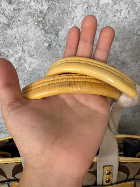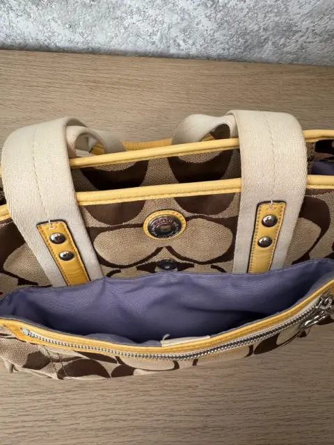 Bolsa de hombro Coach, es amplia y cómoda, su color versátil la ve combinable con todo. Es de Lona y piel billante .Tiene una raspadura en una de sus asas visible en una de sus fotografías.