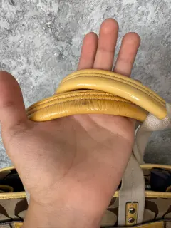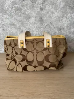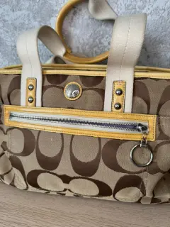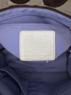 Bolsa de hombro Coach monograma. Bolsa de hombro Coach, es amplia y cómoda, su color versátil la ve combinable con todo. Es de Lona y piel billante .Tiene una raspadura en una de sus asas visible en una de sus fotografías.