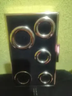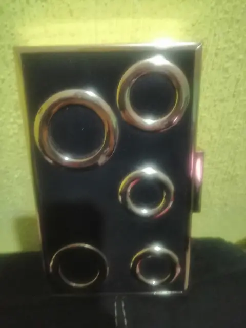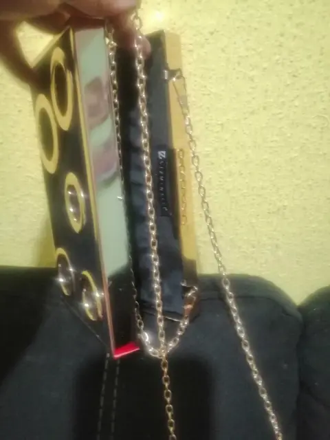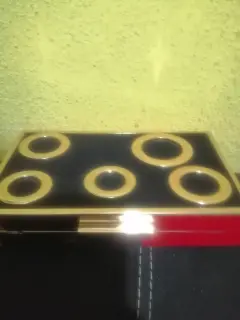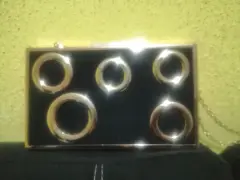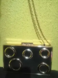 Linda bolso de mano, para toda ocasión.Lizz Minelli bolso de mano negra con círculos dorados en buen estado.