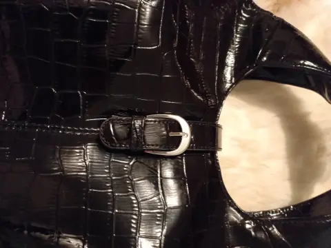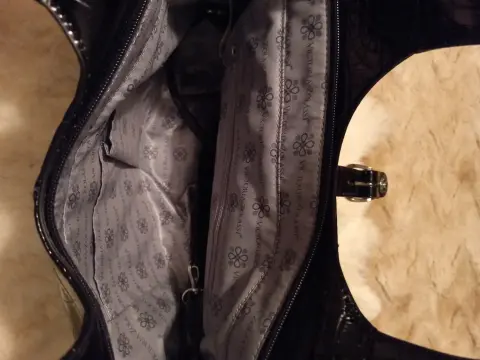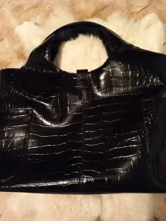 Bolsa de mano color negro con broche tipo hebilla al frente, cierre y en el interior bolsillo con cierre y 2 bolsillos más, además cuenta con una correa ajustable para usar además de las asas, composición de poliester, medidas, 41 cm de ancho, 11 cm de profundo y 47 cm de alto, nueva