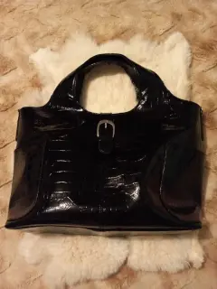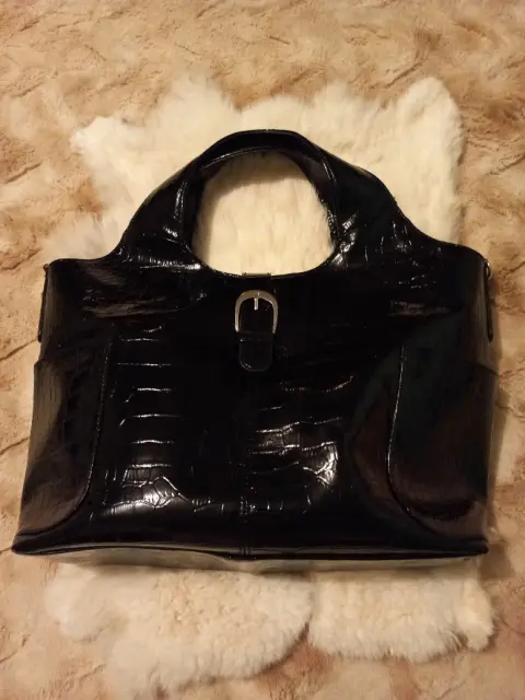 Bolsa de mano. Bolsa de mano color negro con broche tipo hebilla al frente, cierre y en el interior bolsillo con cierre y 2 bolsillos más, además cuenta con una correa ajustable para usar además de las asas, composición de poliester, medidas, 41 cm de ancho, 11 cm de profundo y 47 cm de alto, nueva