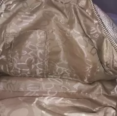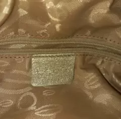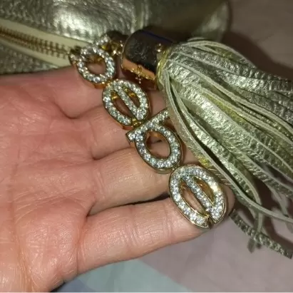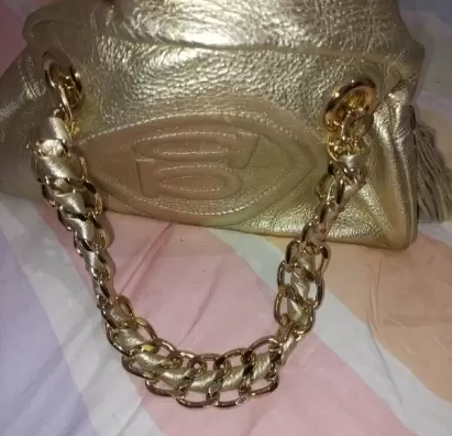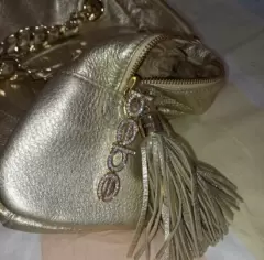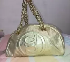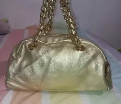 Hermoso bolso dorado con detalles en cadena y nombre de la marca como adorbo. En verdad es hermosa pero no la uso. Medidas: 34cms ancho, 19cms alto y 10 de anchon de base.