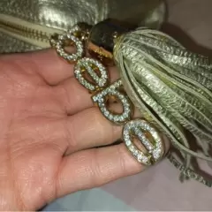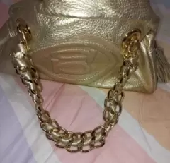 Bolsa de mano bebe. Hermoso bolso dorado con detalles en cadena y nombre de la marca como adorbo. En verdad es hermosa pero no la uso. Medidas: 34cms ancho, 19cms alto y 10 de anchon de base.
