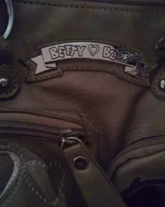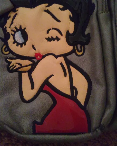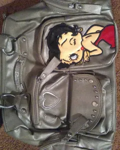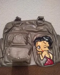 Bolsa de mano Betty boop. Bolsa Betty boop en buen estado color gris mide 40cm x 50cm aprox con tres bolsas frontales y dos a los costados amplia, detalle en piel de bolsa frontal que se aprecia en la foto que no afecta su uso