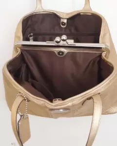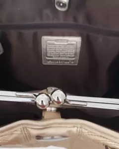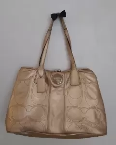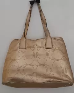 Bolsa dorada de Coach en muy buenas condiciones cierra con imán y broches, azas 3n buen estado no está tallada de la superficie de abajo 3n general esta en buenas condiciones.