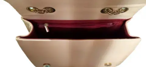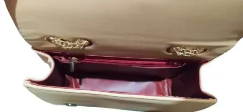 Bolsa de mano color nude inspiración Dior. Bolsa de mano réplica Dior, con botón imantado para cerrar, correa dorada ajustable, forro interno plastificado color vino, cierre y bolsa accesoria. Nueva con etiqueta.Alto 17 cm.Ancho 23 cm.Fuelle 8 cm.