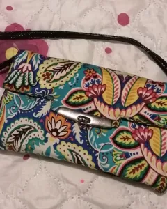 Esta en perfecto estado solo esta un poco arrugado por que estaba guardada, le caben varias cosas como celulares, cartera y maquillajes.