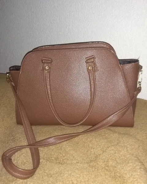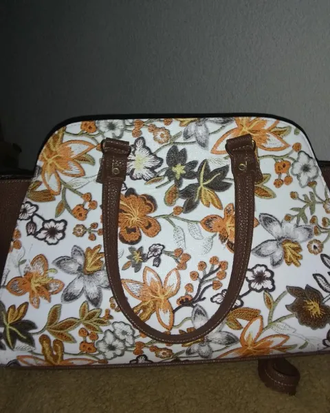 Bolsa de mano imitación piel. Bolsa de mano, imitación piel corte y forro sintético, 50X80 cm aproximadamente, amplia, con correa larga para colgar de forma cruzada, decoracion floral en tonos café y blanco solo se uso una vez sin detalles que dañen se estética
