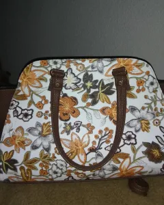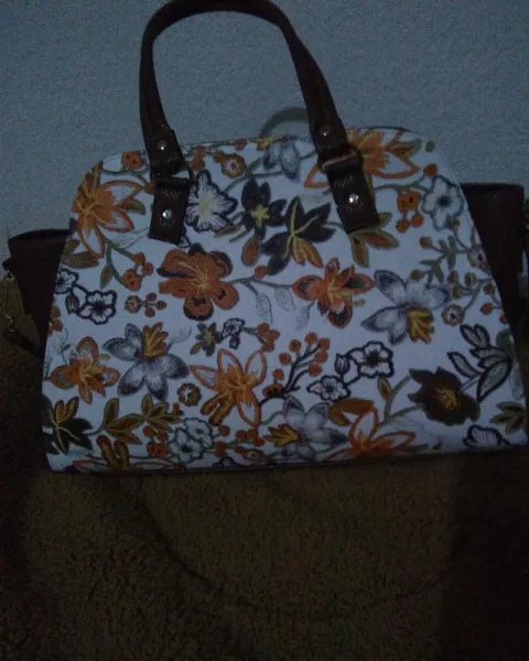Bolsa de mano, imitación piel corte y forro sintético, 50X80 cm aproximadamente, amplia, con correa larga para colgar de forma cruzada, decoracion floral en tonos café y blanco solo se uso una vez sin detalles que dañen se estética